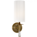The Drunmore Single Sconce by AERIN blends traditional design with contemporary details. Available in solid bronze or bronze with crystal accents, its elongated shade in linen or white glass emits ample illumination, perfect for hallways or bathrooms. Ideal as a single fixture or in multiples.