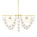 The lavishness of layered necklaces is reflected in the jewelry-inspired Genesis. Swagged and draped along a framework of antique brass-plated steel, strings of opal seedy glass baubles add a dramatic accompaniment to opal glass shades. With a framework, pipe, and canopy of antique brass-plated steel, this elegant fixture adds instant glamour wherever it is placed. Damp-rated, although limited covered outdoor areas may affect finish.