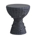 Formed in a classic drum shape, this resin table in black volcanic ash possesses a carved texture to showcase the hand of its maker. Accented with a snake-like detail, it is lightweight for easy portability, with a lower height that makes it an ideal companion for a favorite chaise or daybed.