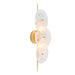 A slim kabob-like backplate lends a pierced effect to shades of hand-blown white glazed glass. Offering a mix of transparency and opacity, each free-form shape is secured with a steel antique brass finial detail and will differ slightly from fixture to fixture. Finish will vary. Damp-rated, although limited, covered outdoor conditions may affect finish.