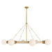 An upscale theater marquee light inspired our oversized, round chandelier. Punctuated with eight globes of matte opal glass, a frame of antique brass-plated iron is covered with hand-stitched sleeves of faux shagreen leather that adds a subtle contrast to the polished surface. The scale and texture of this piece make it an eye-catching option for an entryway or large living room. Finish will vary.