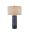 The Polka Dot Blue Table Lamp has a columnar ceramic body with a flowing pattern of circular shapes pressed into it, creating drifts of polka dots. Covered in a reactive glaze, the navy blue table lamp has added depth and texture when a brighter blue color shows through. A metal finial holds the natural linen shade in place.