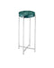 The Rina Teal Drinks Table has a top with a swirling surface created when pearlescent powder was mixed with composite to create the organic patterning. The round disc is inset into the metal frame like a gem. Four legs made of stainless steel in a polished nickel finish are connected by an ex-shaped stretcher. The silver and teal drinks table stands just over 23 inches tall and is 11 inches in diameter, which makes it ideal for rooms where space is limited.