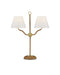 The Sirocco Desk Lamp features a light profile, with all but the main decorative elements wrapped in jute rope. These include the ring at its apex, the small globe connecting the forked arms, and the base itself. Made of wood and plated antique brass, the rope desk lamp is fitted with two off-white linen shades. This dressy desk lamp is designed to be a decorative and functional accent in a space.